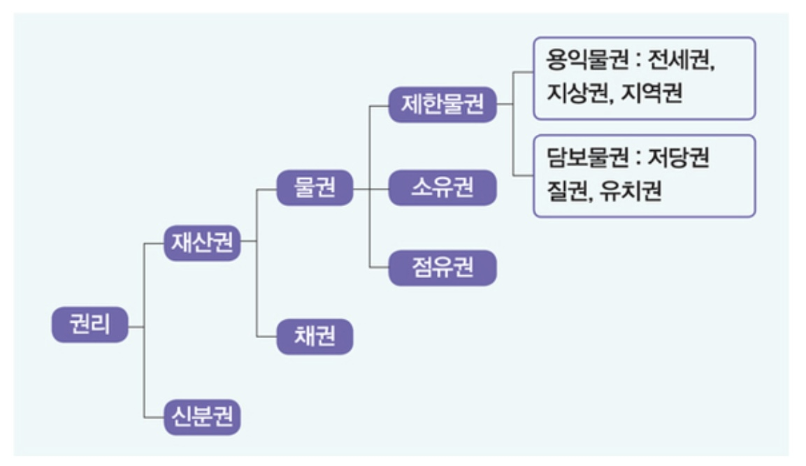 먼저 물권(物權)에 대해 알아보면, 물건은 '소유권' (사용`수익`처분할 수 있는 권리)과 '전세권`지상권`지역권'(사용`수익 하며 때에 따라 처분할 수 있는 권리로, 용익물권이라고 한다.),